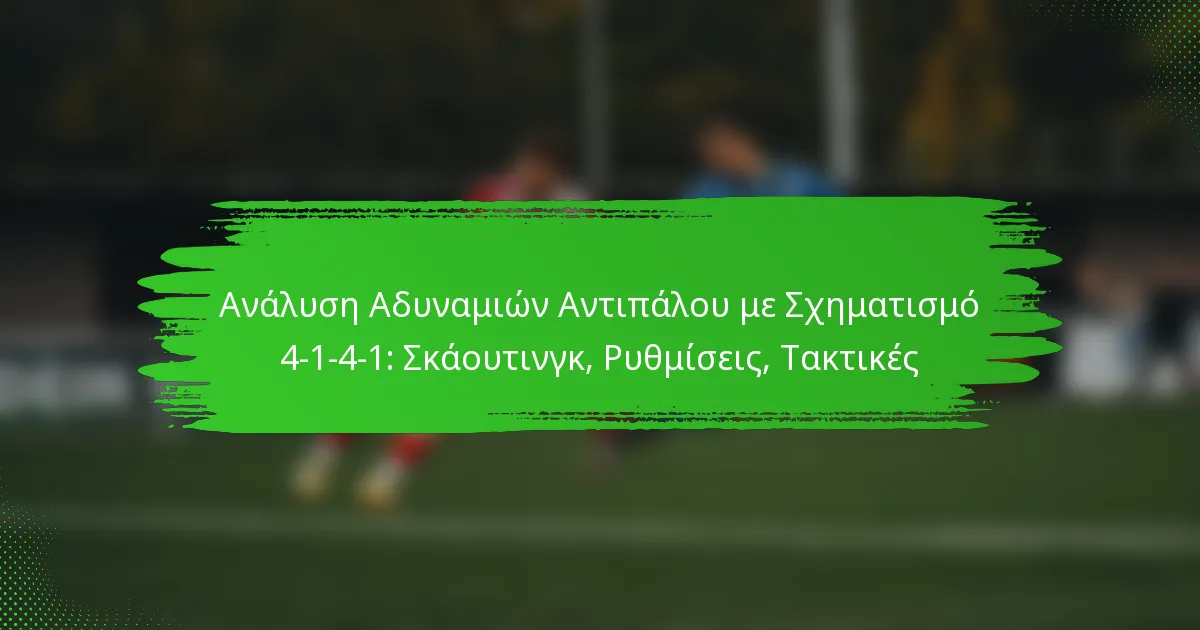 Η διάταξη 4-1-4-1 είναι μια ευέλικτη τακτική ρύθμιση στο ποδόσφαιρο που ισορροπεί τη defensive σταθερότητα με μια ισχυρή παρουσία στη μεσαία γραμμή. Η αποτελεσματική σκάουτινγκ είναι απαραίτητη για την αναγνώριση των αδυναμιών των αντιπάλων, επιτρέποντας στους προπονητές να προσαρμόσουν τις στρατηγικές τους και να κάνουν προσαρμογές σε πραγματικό χρόνο. Εκμεταλλευόμενοι τα πλεονεκτήματα και τις ευπάθειες των αντιπάλων ομάδων, η διάταξη 4-1-4-1 μπορεί να προσαρμοστεί δυναμικά για να ενισχύσει την απόδοση στο γήπεδο.
